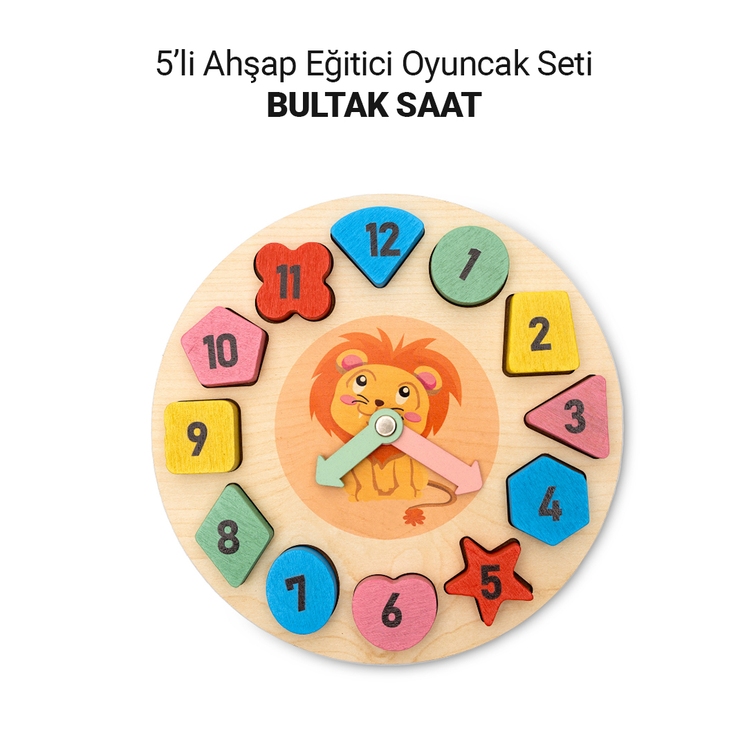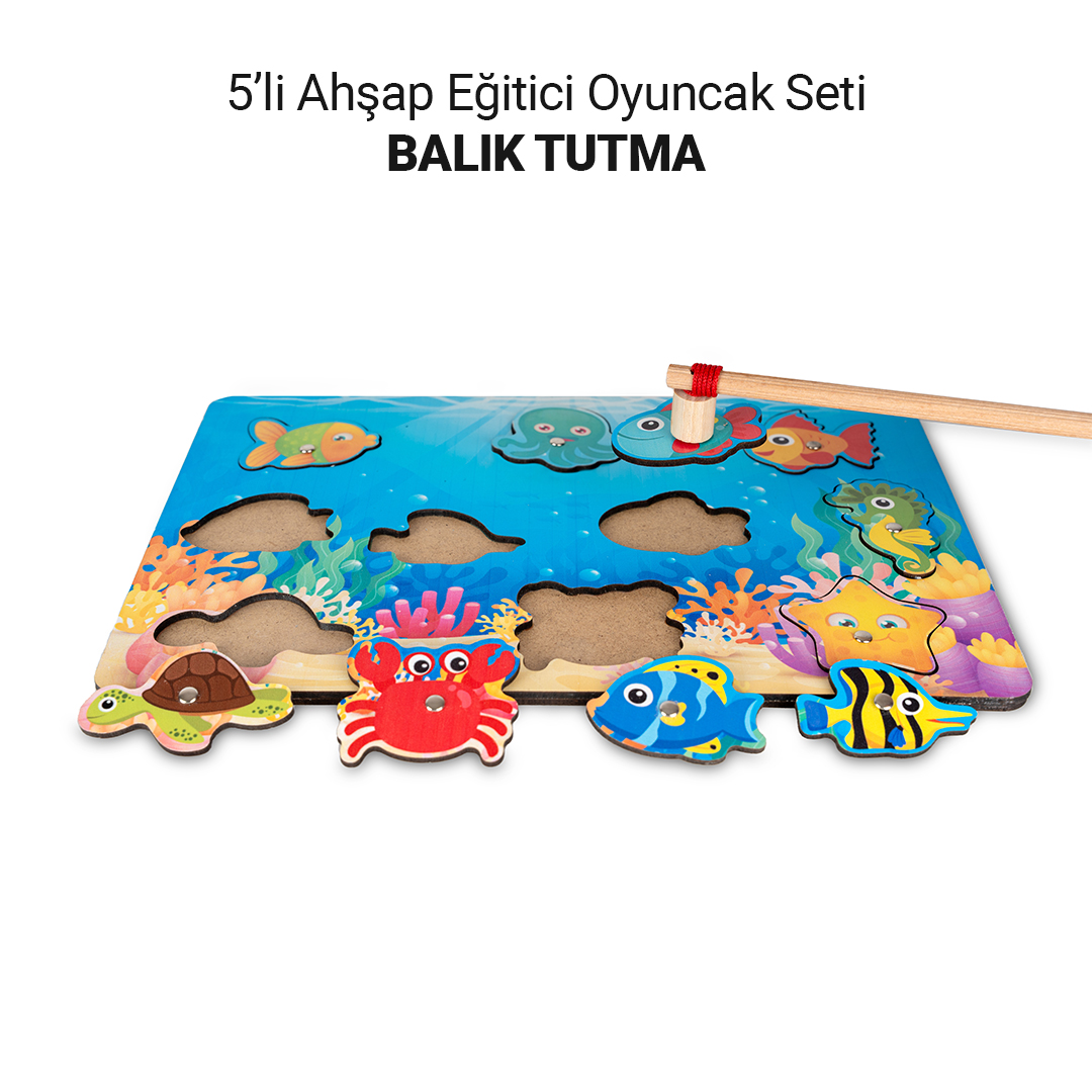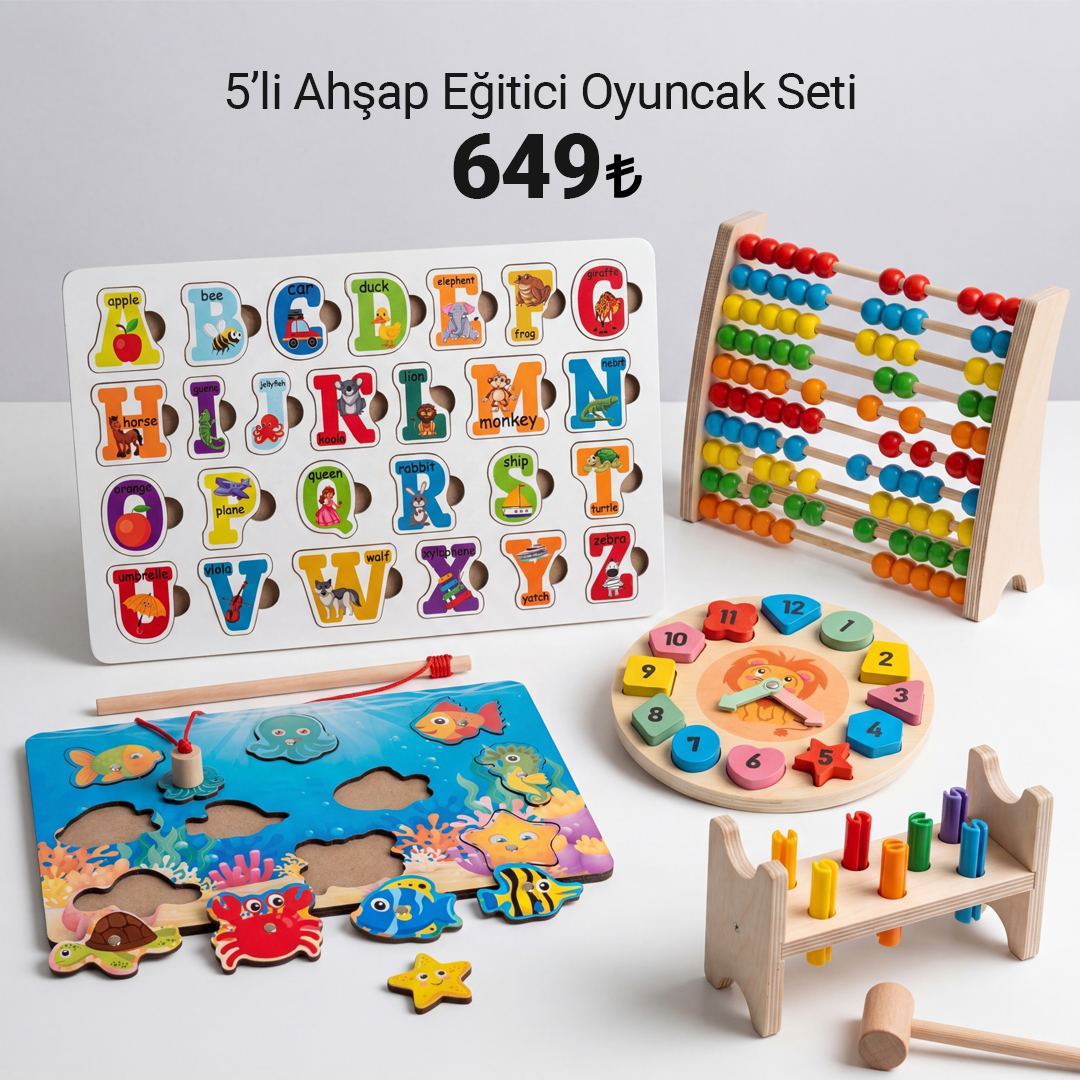 5’li Ahşap Eğitici Oyuncak Seti, çocukların hem eğlenerek vakit geçirmesi hem de gelişimlerini desteklemesi için hazırlanmış özel bir aktivite setidir. Set içerisinde yer alan Balık Tutma, Bul Tak Saat, Çak Çak, Harf Puzzle ve Renkli Abaküs oyunları sayesinde çocuklar el-göz koordinasyonu, ince motor becerileri, dikkat, odaklanma, harf-sayı farkındalığı ve problem çözme becerilerini geliştirebilir. Doğal ahşap yapısı, renkli tasarımı ve eğitici içeriğiyle evde kaliteli zaman geçirmek isteyen aileler için ideal bir tercihtir. 2 yaş ve üzeri çocuklar için uygundur. Yetişkin gözetiminde kullanılması tavsiye edilir.