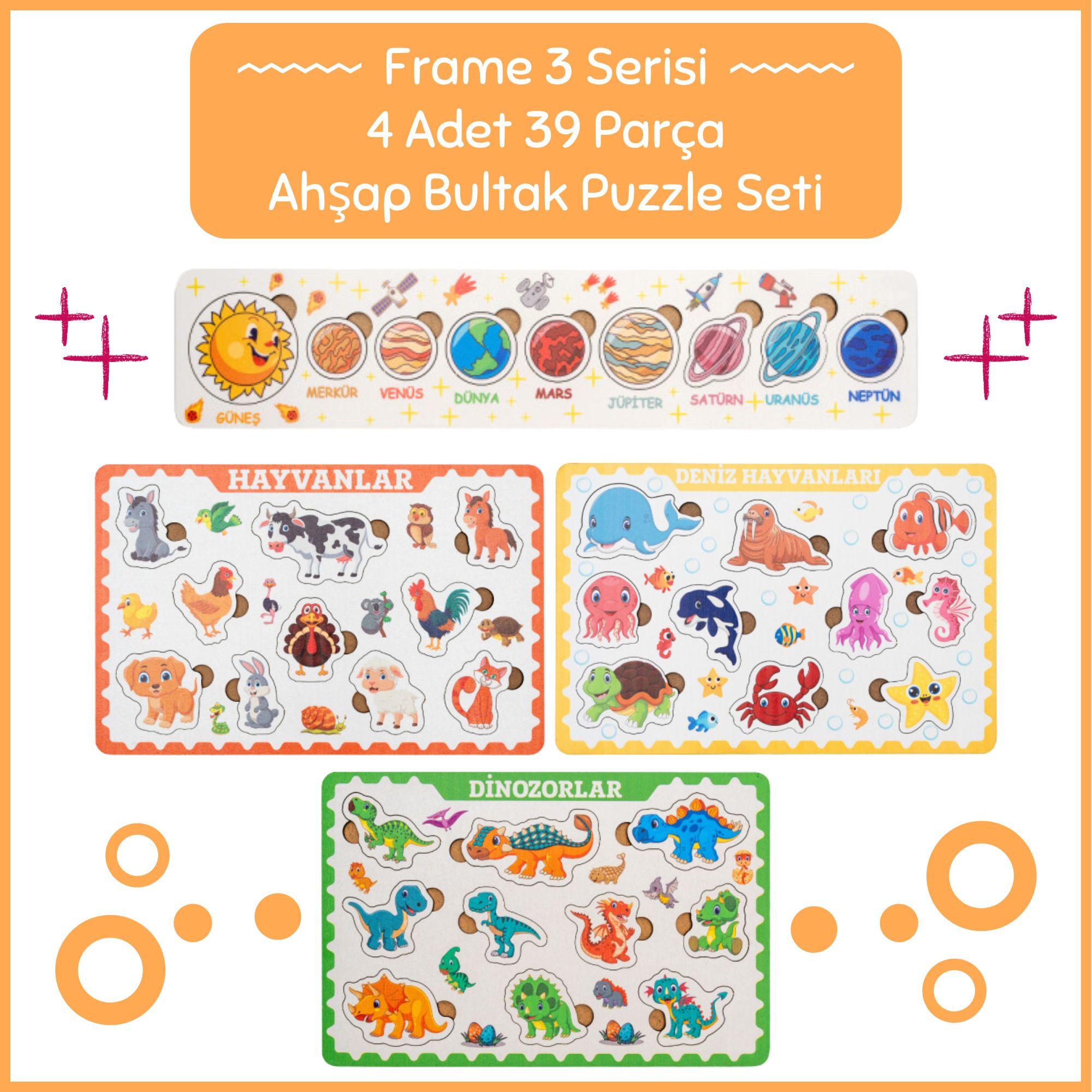 Paket İçerisinde Gezegenler, Çiftlik Hayvanları, Deniz Hayvanları ve Dinazorlar Temalı Bultak Puzzle lar Vardır.