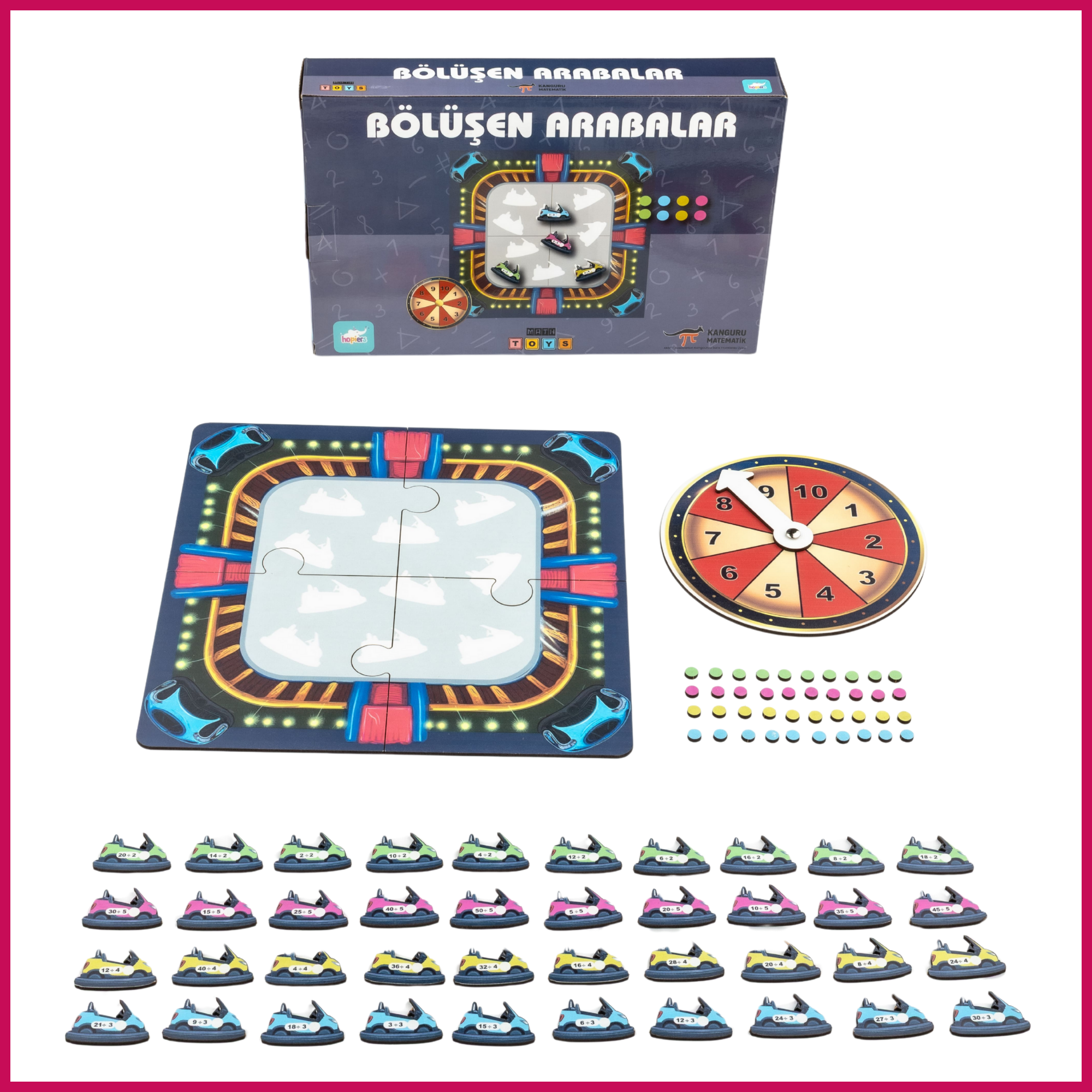 Matematik yarış pistindeki arabalarla bölüşme zamanı! Amacınız, çarkta gelen sonuca ait bölme işlemini bularak en çok arabayı kapmak ve yarışı kazanmak.