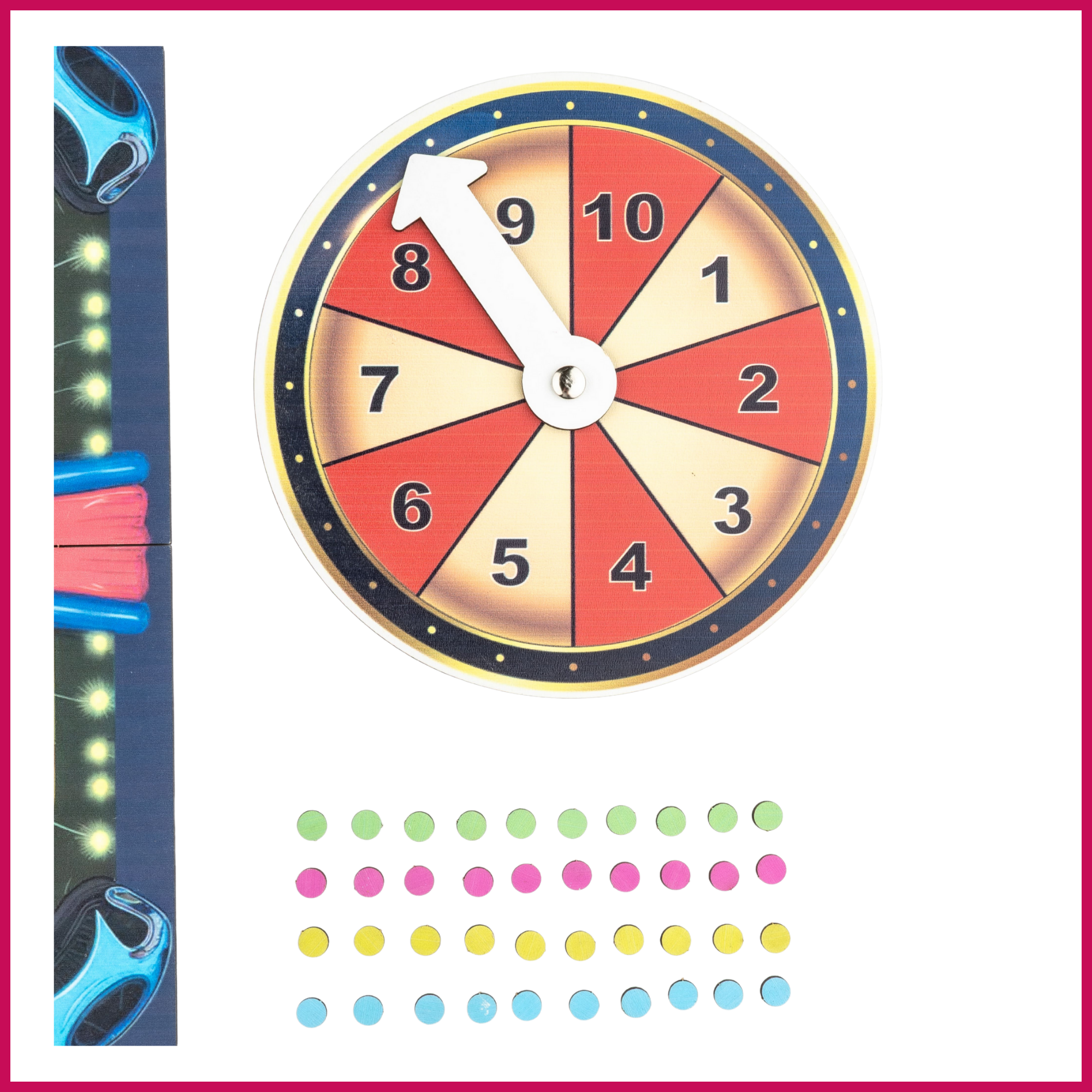Eğlenceli Tasarım: Renkli araba temalı kartlar ve çocuklara özel çark.
