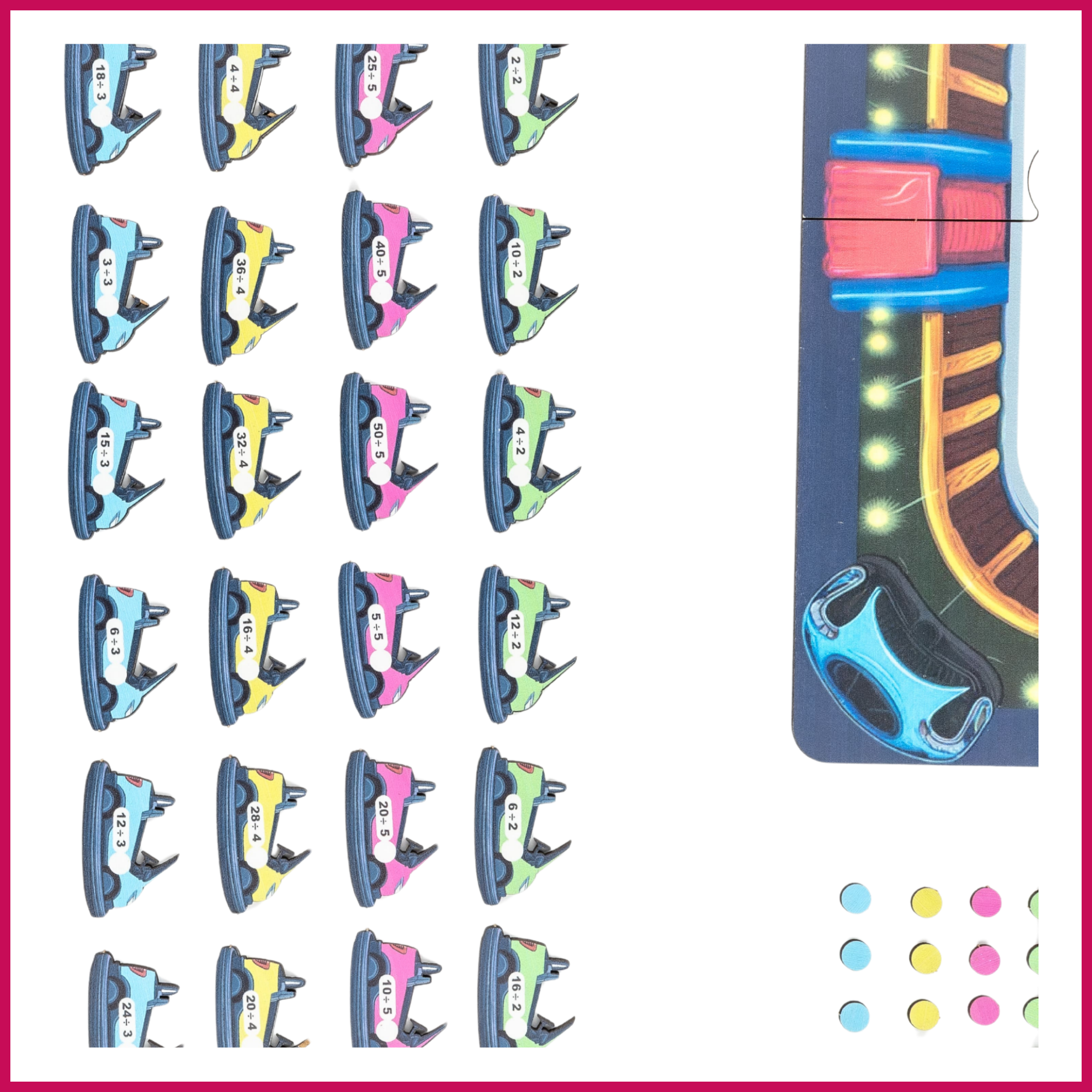 Pist Hazırlığı: 10 adet "oto kartı" (12÷3, 20÷4 gibi) parkura yerleştirin. Her oyuncu 10 pul alır.