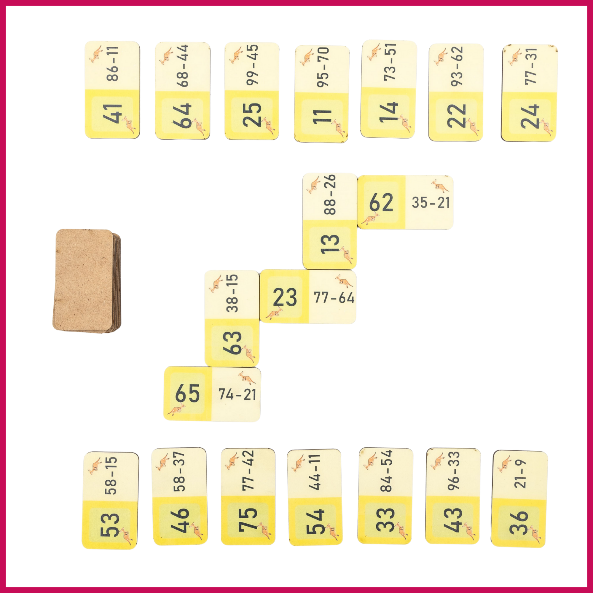 Başlayan oyuncu, elindeki eşleşen kartı (Örn: "35" ↔️ "58-26") yere dik olarak yerleştirir.