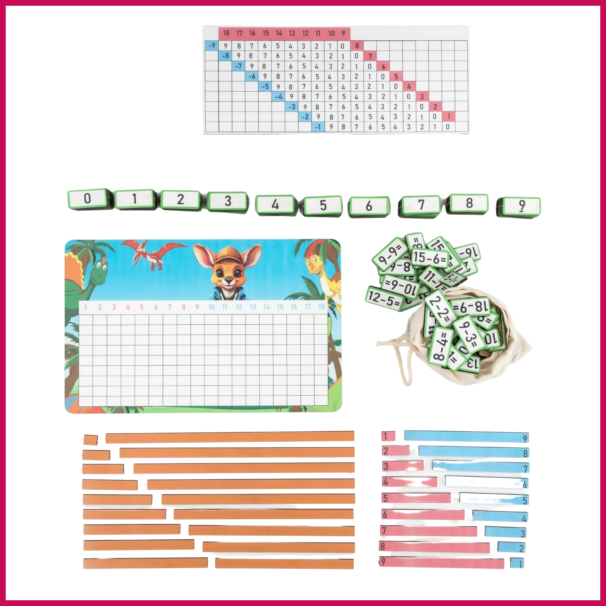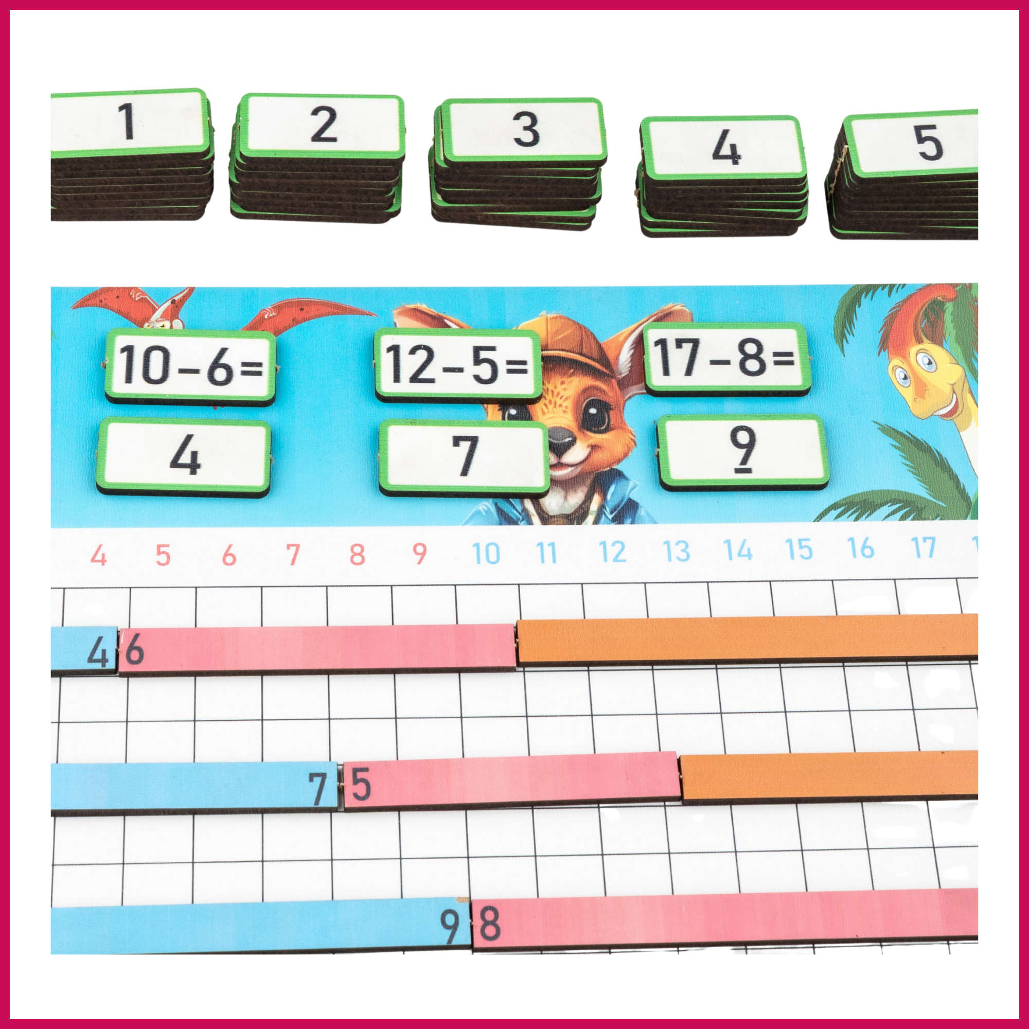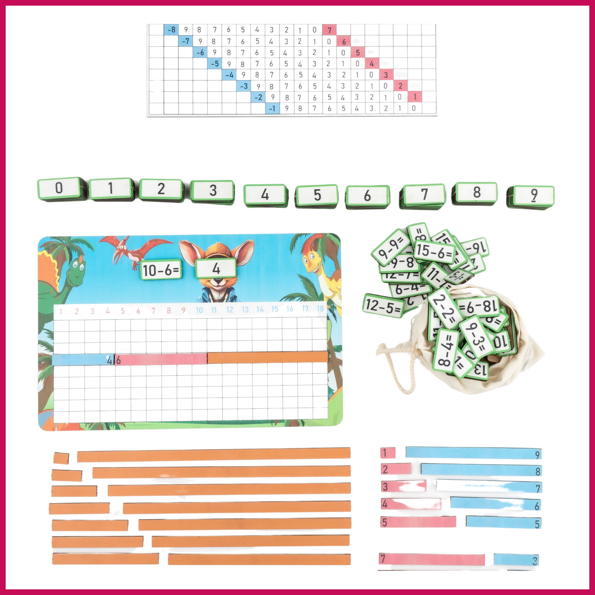 İçerik: Renkli çubuklar, sayı şeridi, işlem kartları, oyun kılavuzu.