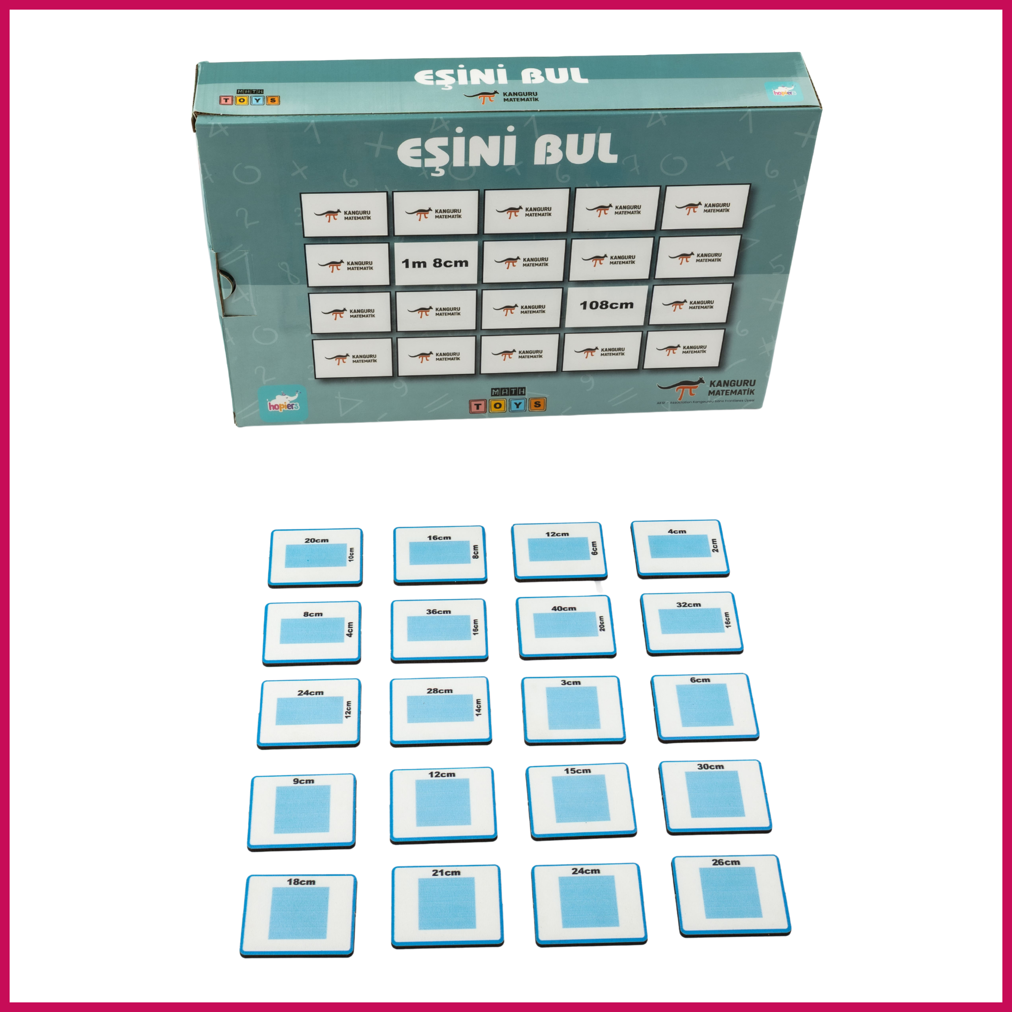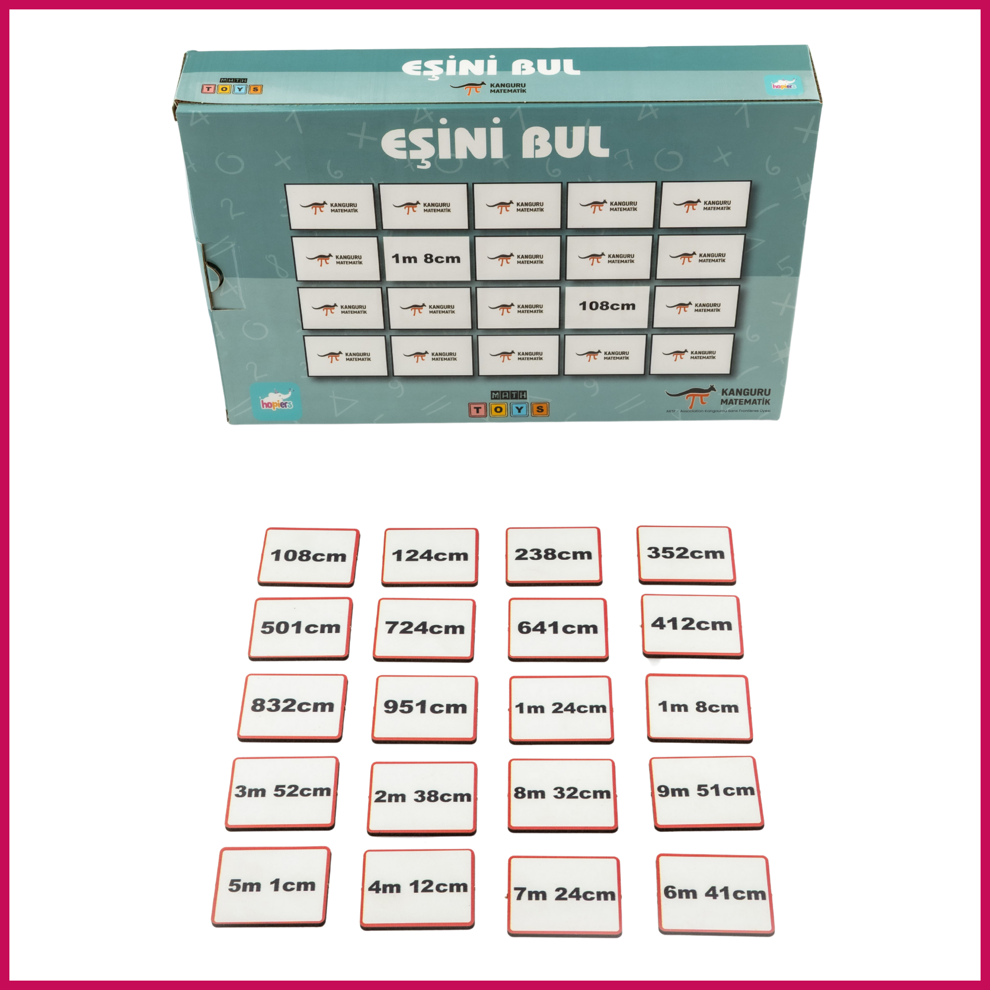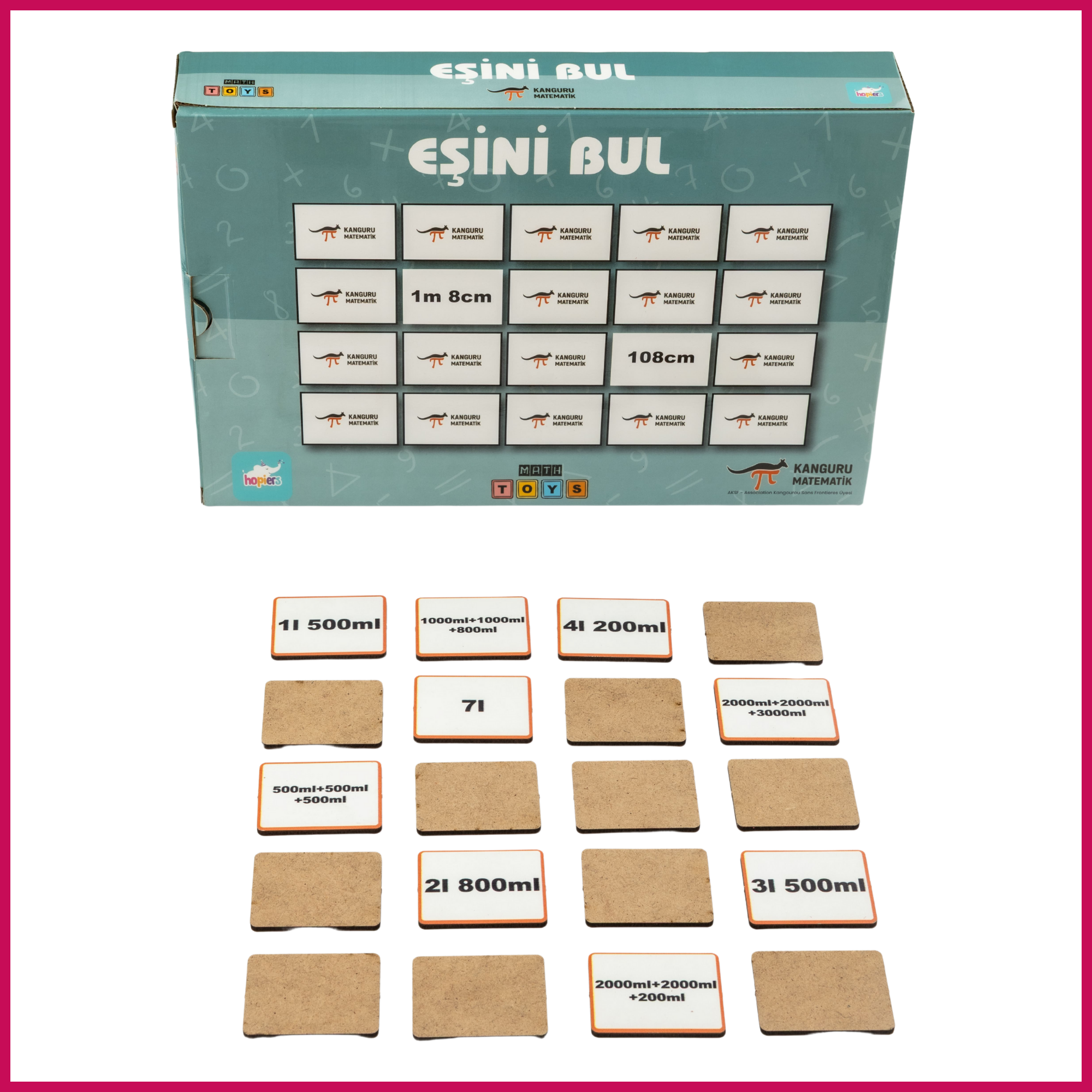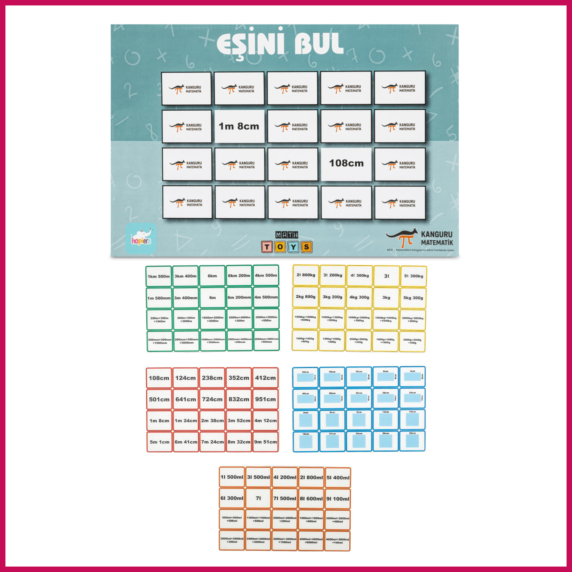 Eşini Bul oyunu, çocukların uzunluk (cm/m), ağırlık (kg/g), hacim (ml/L) gibi ölçü birimlerini ve dönüşümlerini eğlenerek öğrenmesi için tasarlanmıştır. Hafıza oyunu formatıyla matematiği keyifli hale getirir!