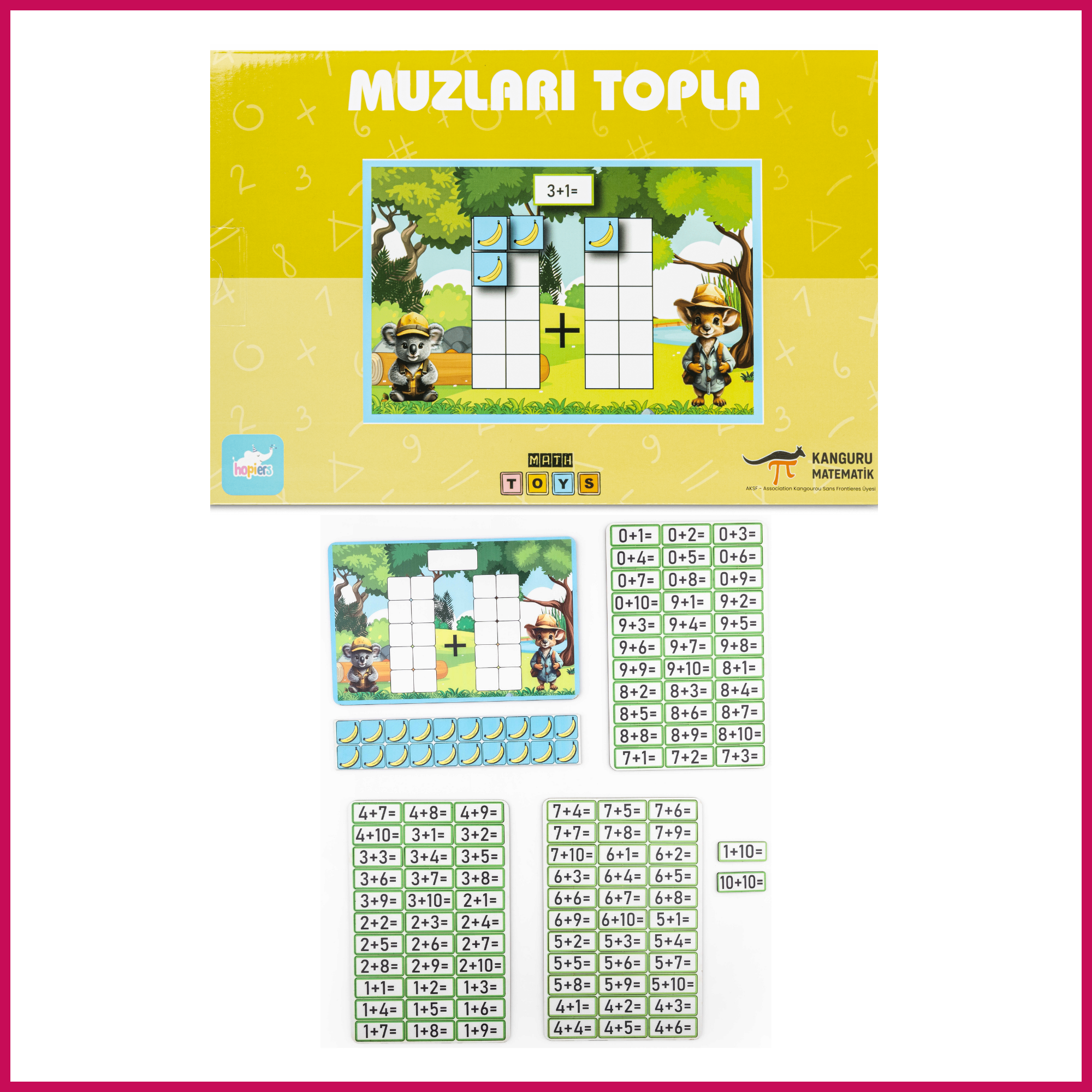 Muzları Topla oyunu, çocukların toplama işlemlerini somutlaştırarak öğrenmesi için tasarlanmış neşeli bir Hopiers Kanguru Matematik serisi oyunudur. Piknikteki muzları toplarken matematik becerilerini keşfedecekler!