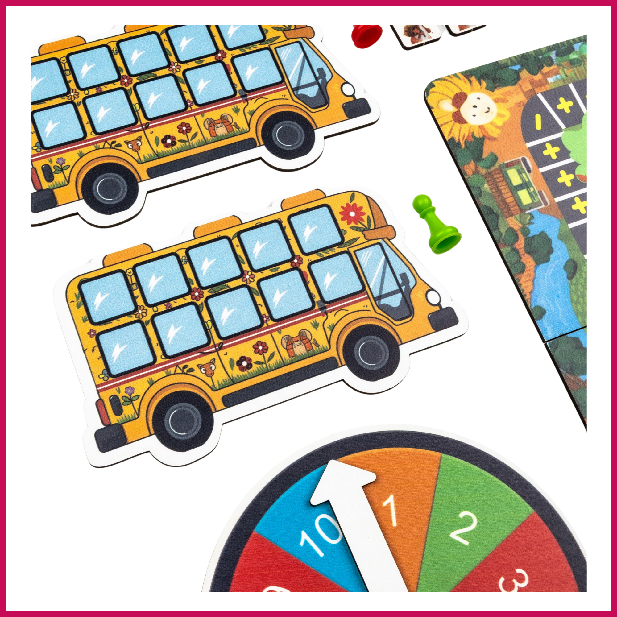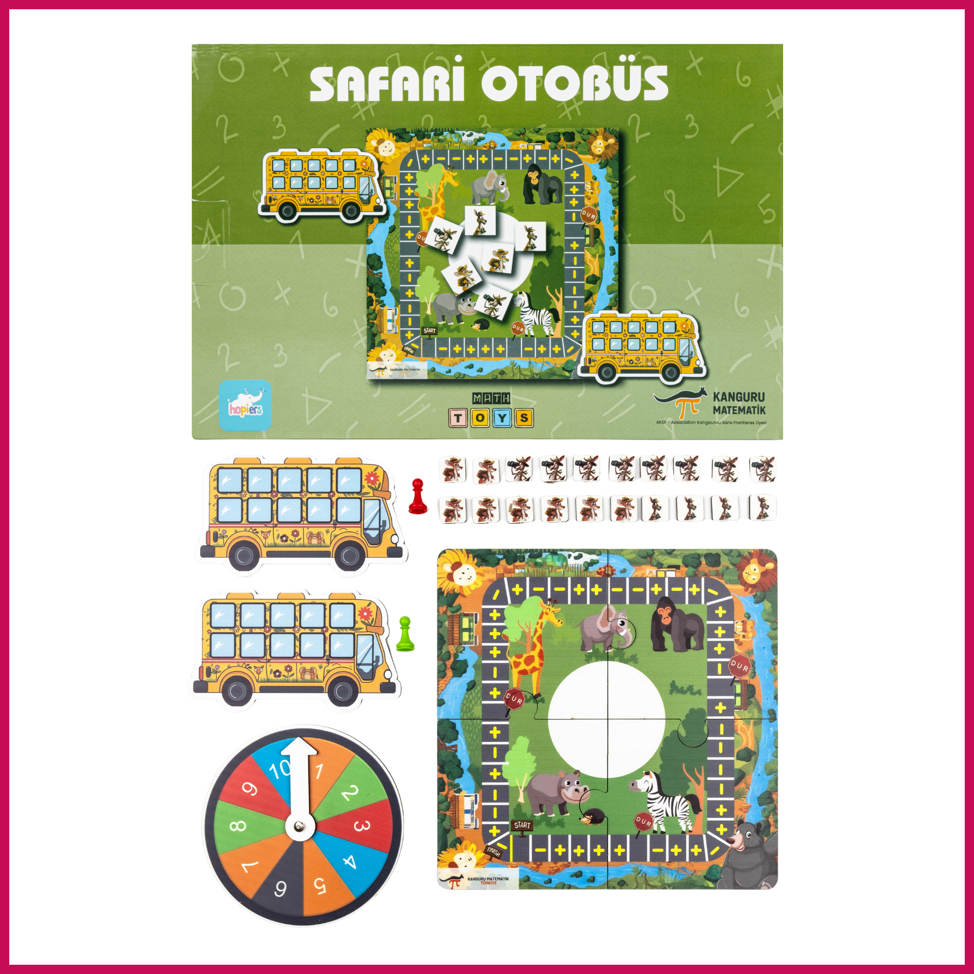 Safari Otobüs oyunu, çocukların toplama ve çıkarma işlemlerini egzotik orman macerasıyla öğrenmesi için tasarlanmıştır. Otobüs şoförü olan çocuklar, yolcuları ormana bırakırken matematik becerilerini geliştiriyor!