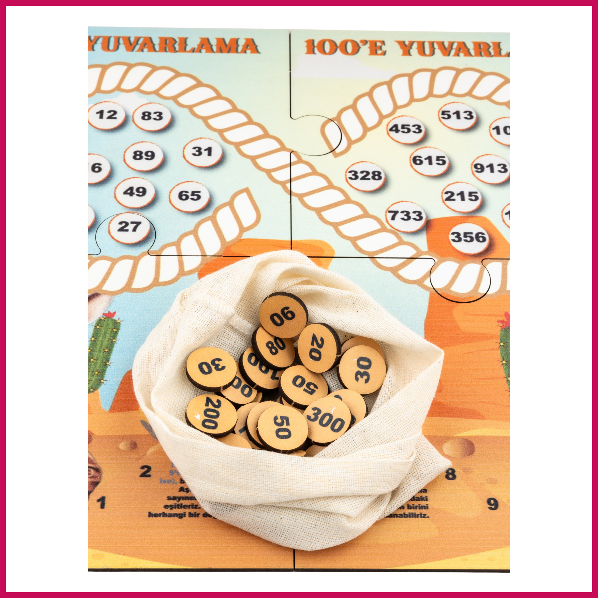 İçerik: 1 adet oyun tahtası, 50+ yuvarlama pulu, saklama kesesi, oyun kılavuzu.