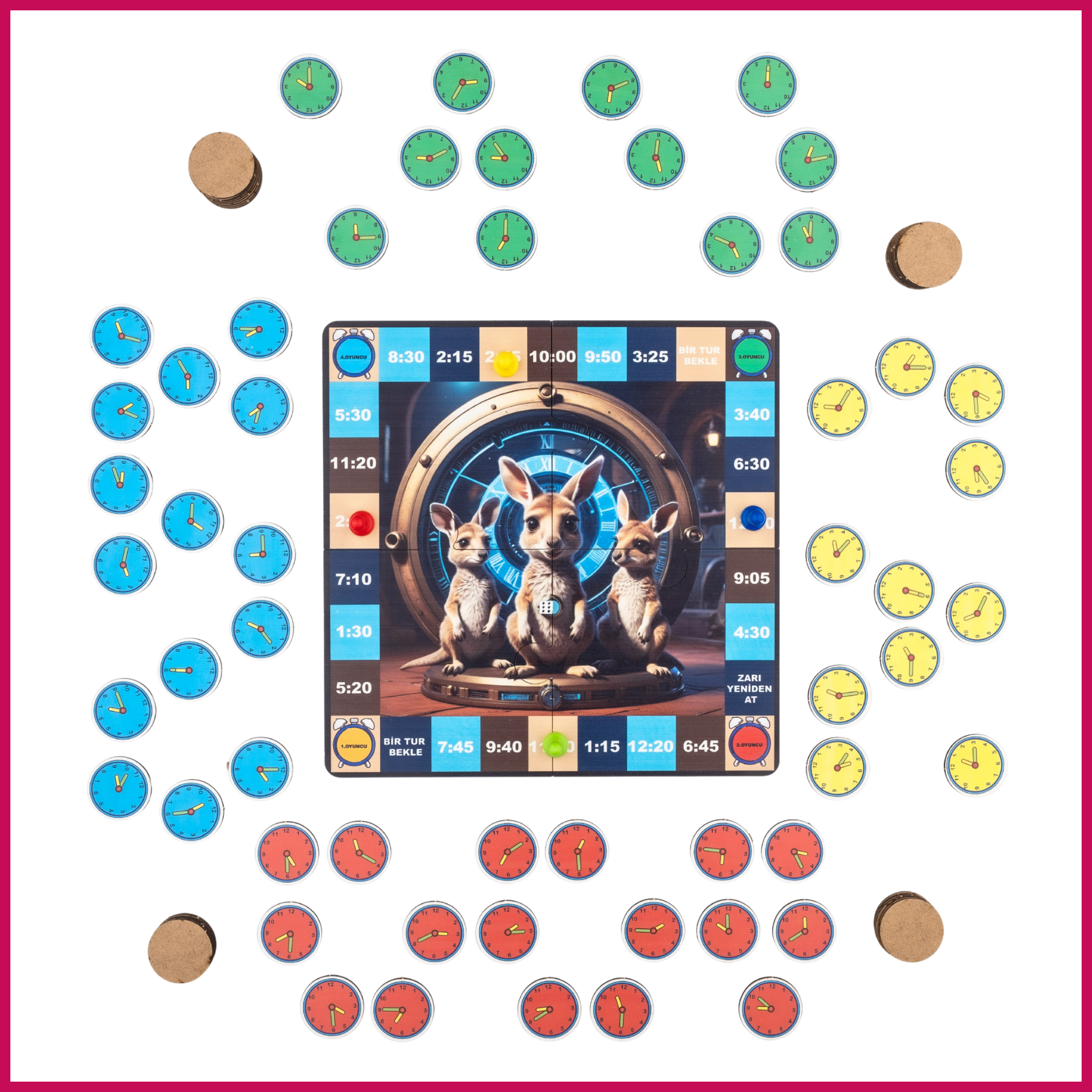 Yolculuk Hazırlığı: Her oyuncu bir piyon seçer. Analog saat kartları eşit şekilde dağıtılır.