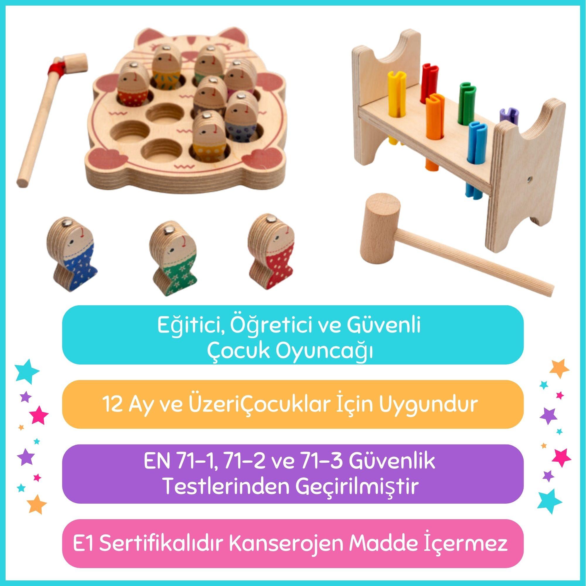 Montessori 3 Boyutlu Ahşap Balık Tutma Oyunu + Montessori Ahşap Çak-Çak Çekiç Oyunu