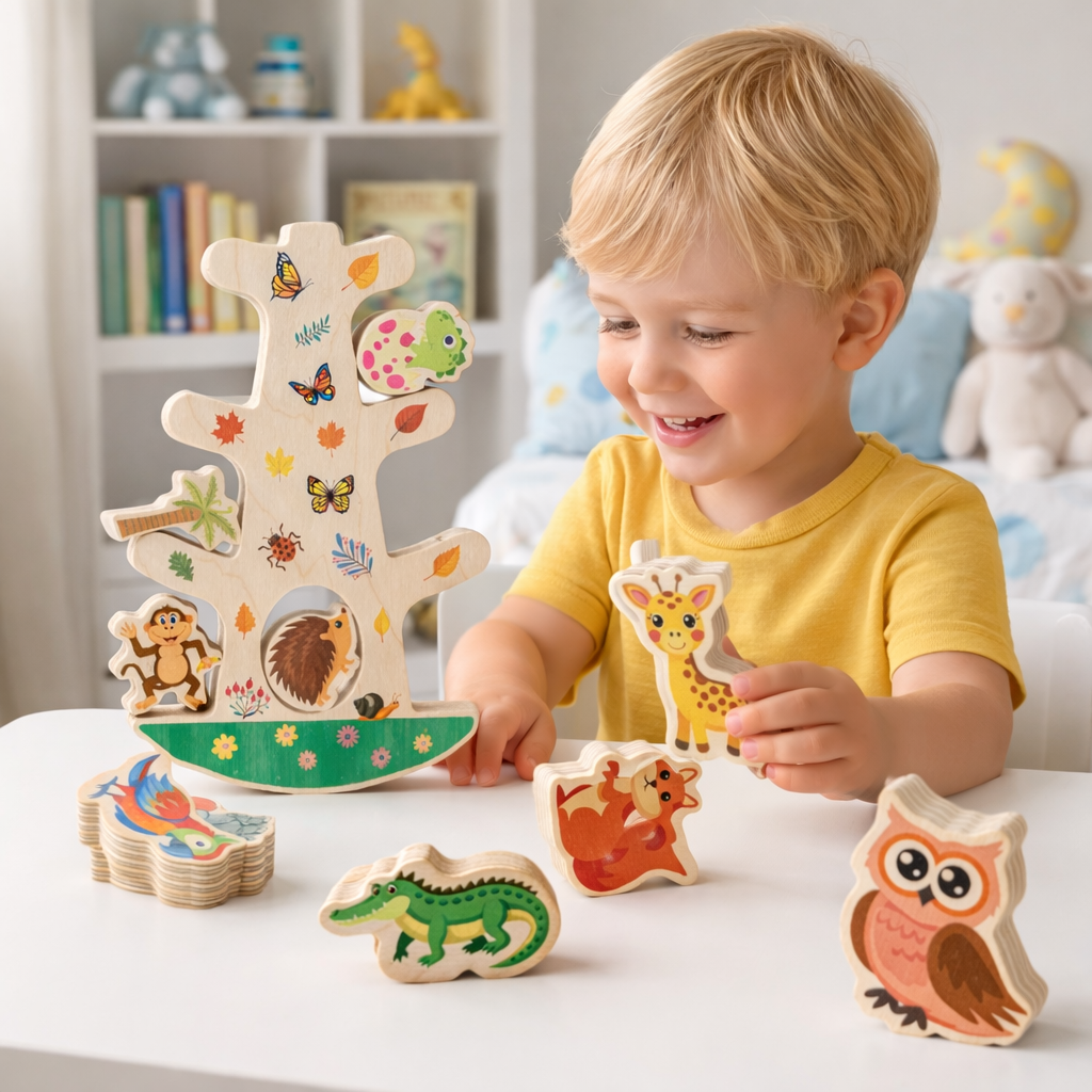 Montessori Ahşap Denge Ağacı & Ahşap Dinozorlar Seti, erken çocukluk döneminde denge, koordinasyon ve hayal gücünü aynı oyun alanında buluşturan, açık uçlu bir eğitici oyuncak setidir.