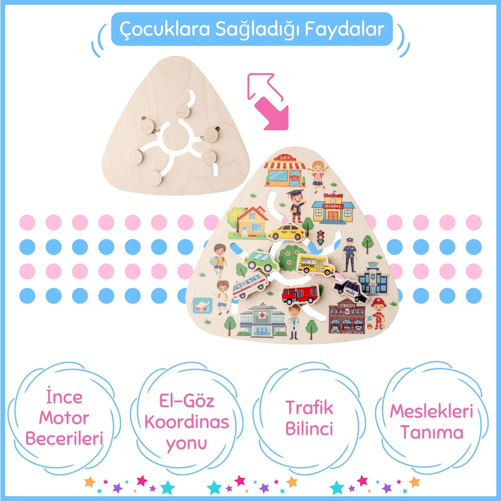 Minikler, trafik kurallarını ve araçları tanırken; aynı zamanda ambulans, itfaiye, polis gibi meslekleri keşfedecekler. Ahşap yollar üzerinde arabaları yönlendirerek el-göz koordinasyonlarını güçlendirecek, problem çözme yeteneklerini geliştirecekler.
