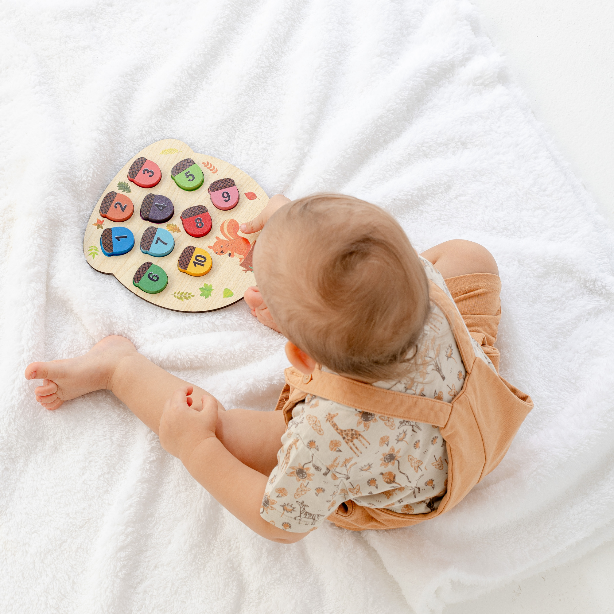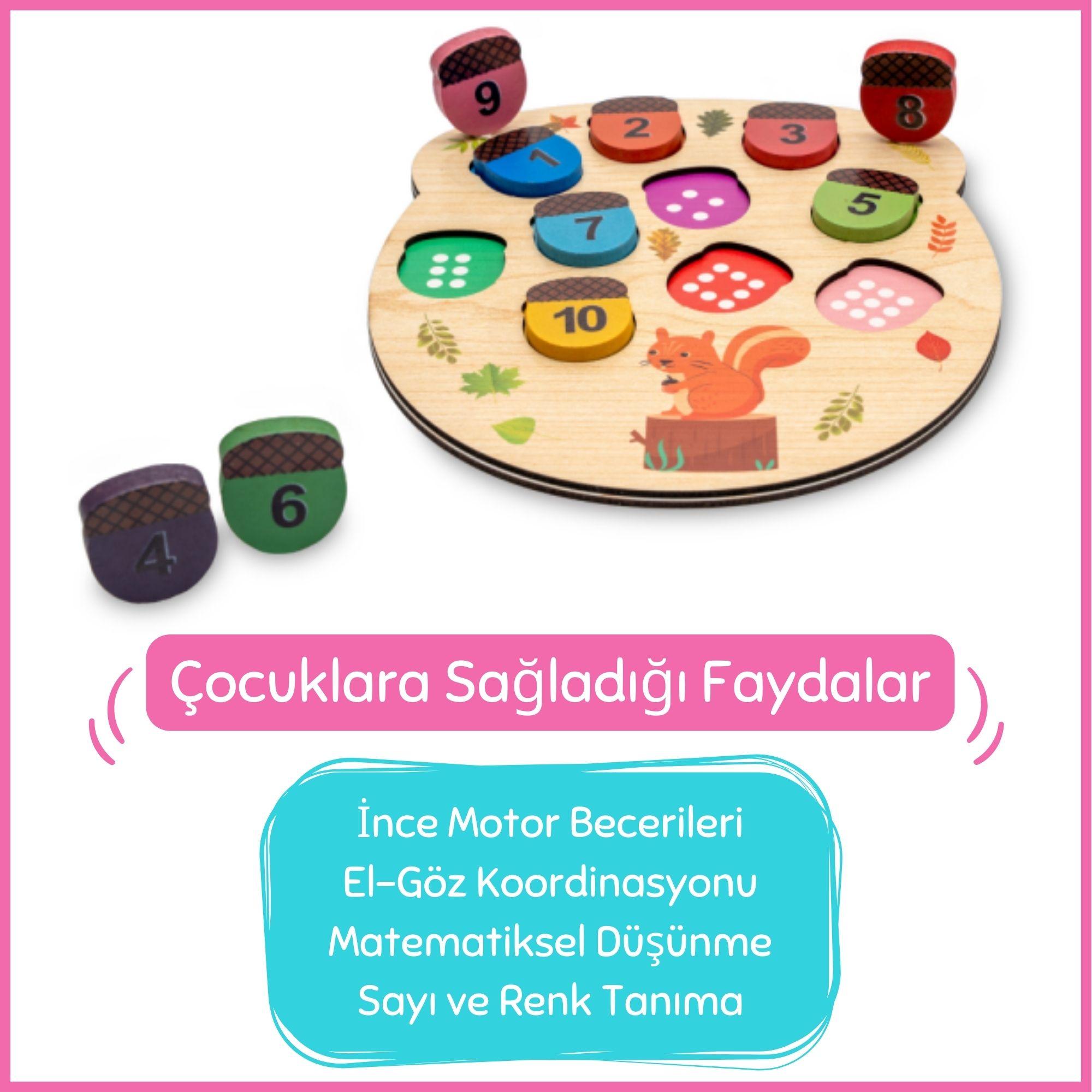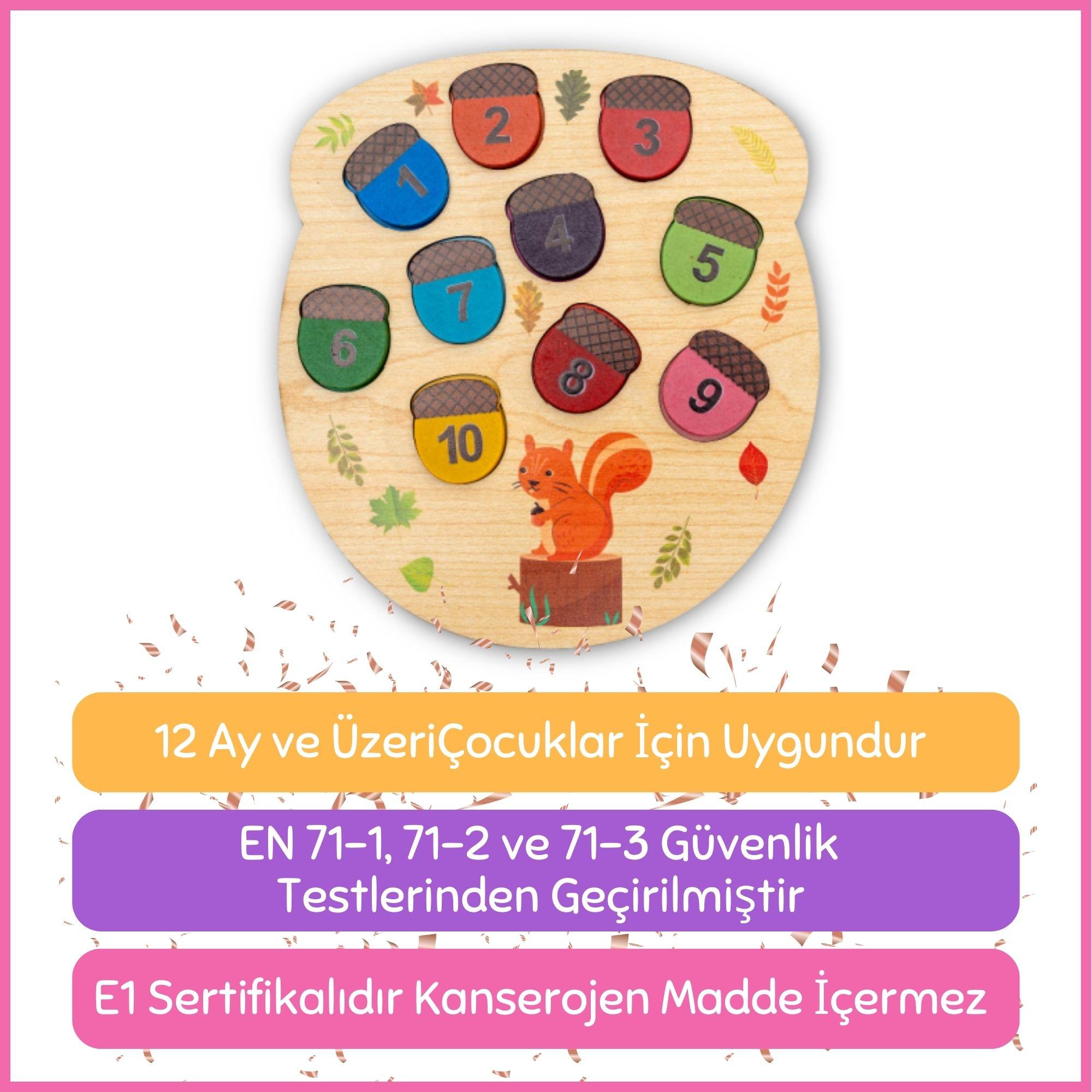 Parça Sayısı: Set içerisinde renkli rakamlar ve sincap temalı ahşap figürler bulunur. Ayrıca, rakamların yerleştirileceği bir ahşap tahta içerir.