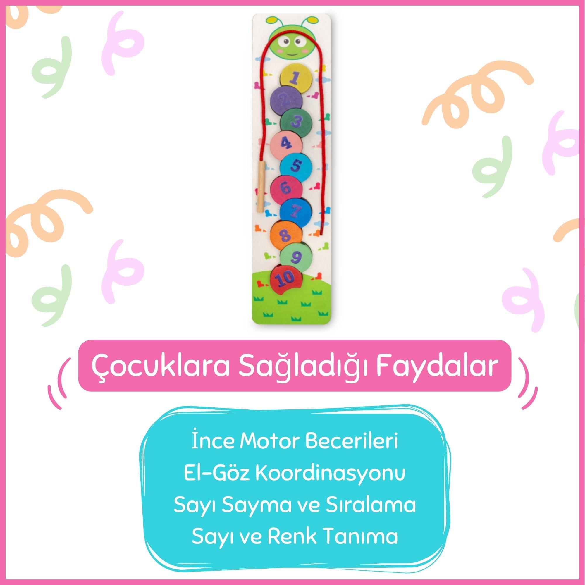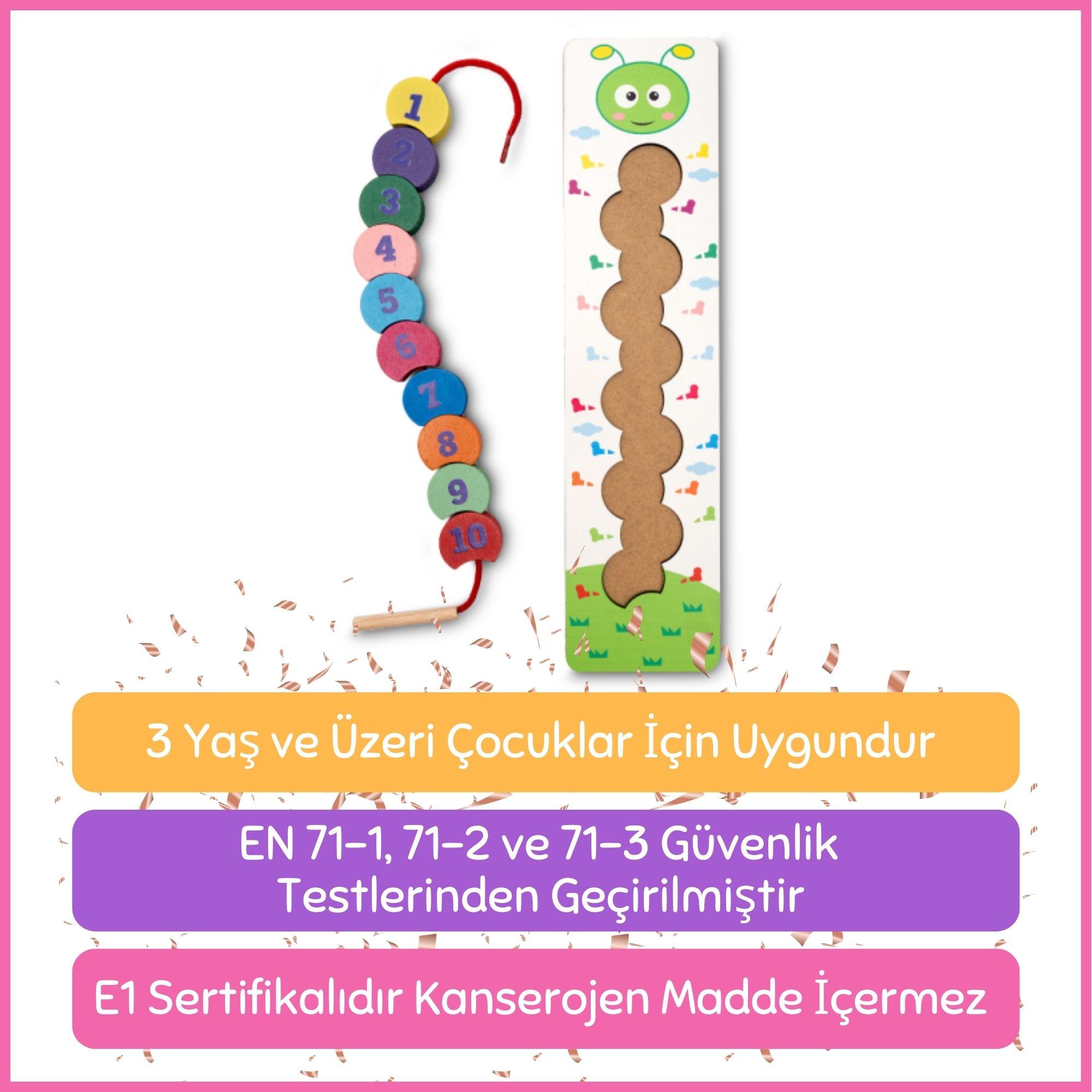 Parça Sayısı: Set içerisinde renkli ahşap boncuklar ve bir adet ip bulunur. Tırtıl figürü, çocuğunuzun boncukları dizebileceği şekilde tasarlanmıştır.