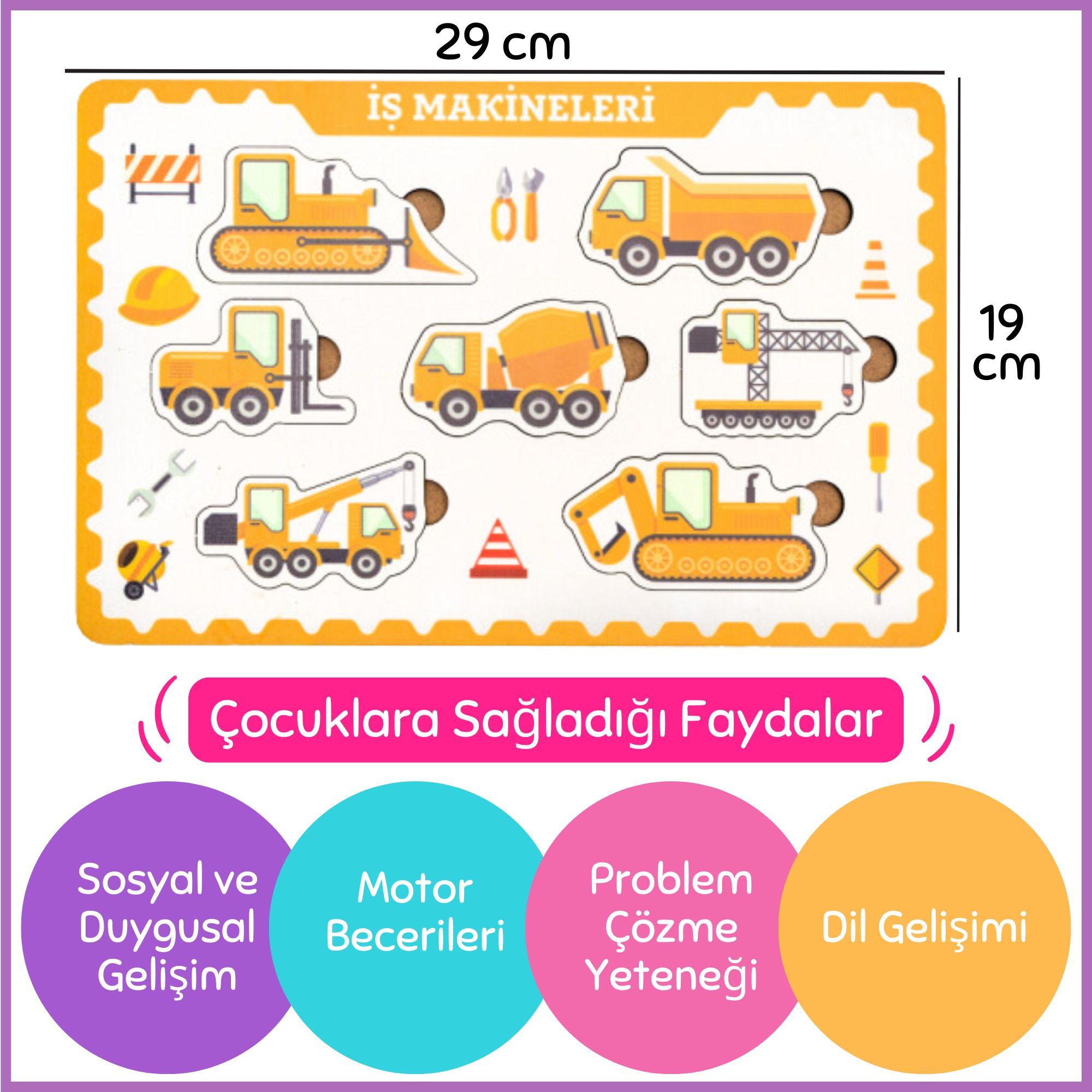 Ahşaptan üretilen bu eğitici oyuncak, çocukların farklı iş makinelerini tanımasına ve anlamasına yardımcı olur. Canlı renkler ve dikkat çekici tasarımlarla çocuklar, eğlenceli bir şekilde öğrenmenin keyfini çıkaracaklar.